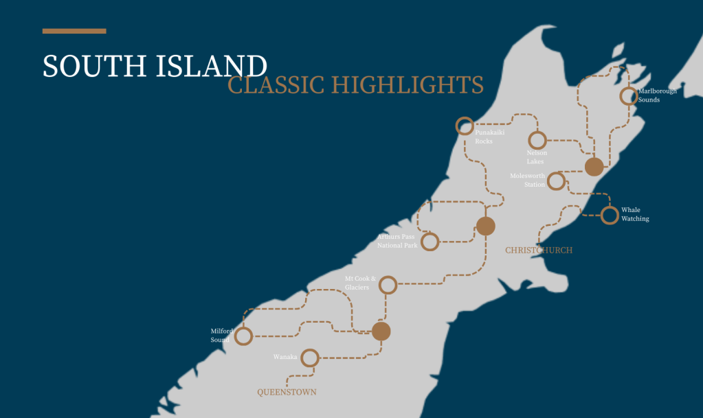 Spend the day discovering the best of coastal Marlborough and northern South Island. Choose to explore the Marlborough Sounds, an intricate maze of emerald waters and forested peninsulas, or venture toward the golden beaches of Golden Bay. We can tailor your day around your interests, from private boat charters and gourmet vineyard tastings to remote beach picnics.